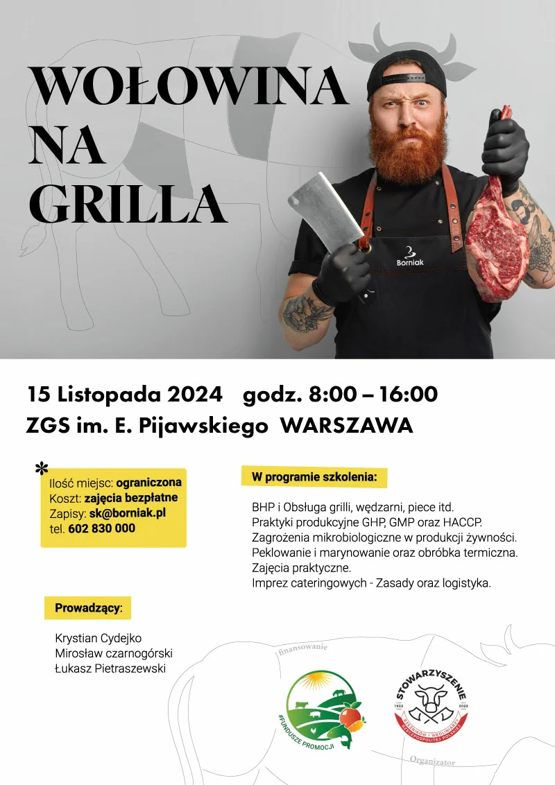 Zapraszamy na bezpłatne szkolenie „Wołowina na grilla” w Zespół Szkół Gastronomicznych im. prof. Eugeniusza Pijanowskiego w Warszawie. Szkolenie zapewni solidne podstawy z zakresu przygotowywania wołowiny. Ilość miejsc jest ograniczona, dlatego warto się pospieszyć! W programie przewidziano szczegółowe omówienie zasad BHP oraz obsługi sprzętu, w tym grilli, wędzarni i pieców. Uczestnicy poznają również praktyki produkcyjne zgodne z normami GHP, GMP oraz HACCP, dowiedzą się o zagrożeniach mikrobiologicznych związanych z produkcją żywności, a także nauczą się technik peklowania, marynowania i odpowiedniej obróbki termicznej mięsa. Dodatkowo odbędą się zajęcia praktyczne oraz omówione zostaną zasady i logistyka organizacji imprez cateringowych.